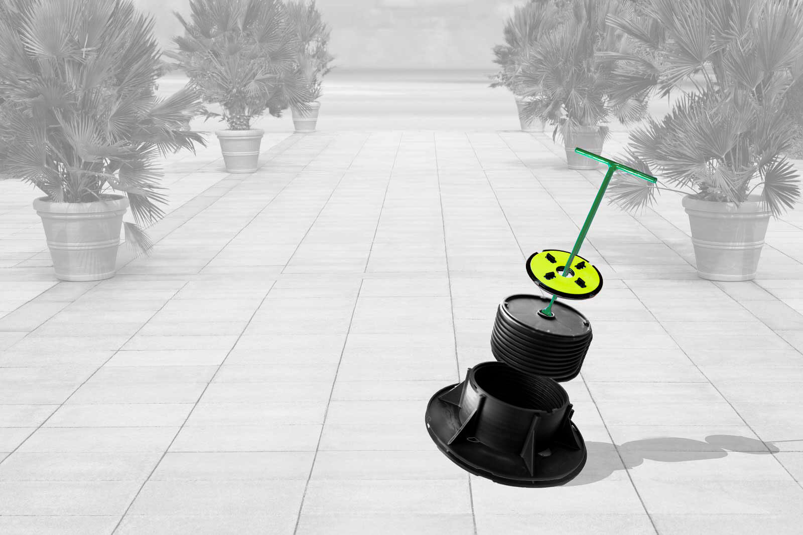 MAKS self-levelling disc is an accessory used for laying terrace on pedestals on sloping or uneven ground. The use of this accessory makes it possible to create or catch up to 5% of slope over 1 meter. It is compatible with pedestals for joist as well as with pedestals for tiled terraces. Simple to use, add the disc only where you need it: it clips under the pedestal with the snap of a finger.